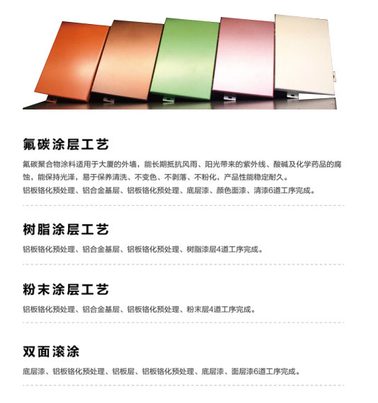 氟碳涂層具有抗腐蝕性和耐候性,耐冷性好,能抵御強(qiáng)烈的紫外線(xiàn)的照射,并長(zhǎng)期保持不褪色、不粉化、涂屏均勻,色彩豐富多樣,使用壽命長(zhǎng)。